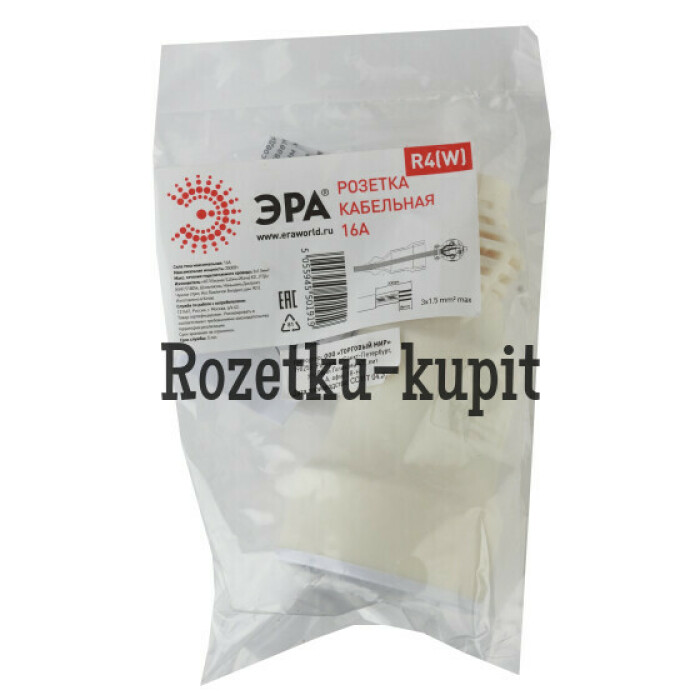 Розетка штепсельная ЭРА R4(W), с заземлением, максимальная мощность - 16A/3500Вт (кабель до 3x1,5 мм2), поликарбонат