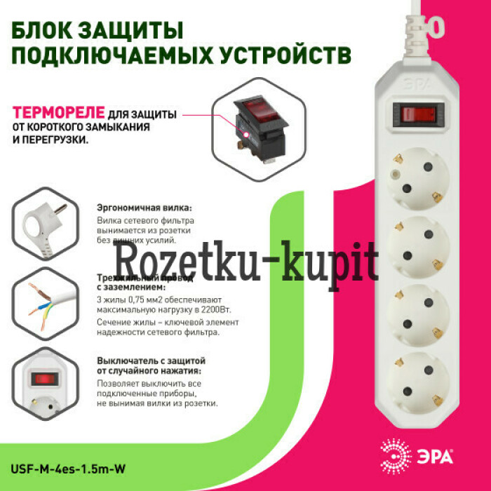 Сетевой фильтр ЭРА USF-M-4es-1.5m-W с защитой от перегрузки сети по-настоящему необходим в современном доме. Он позволяет подключить к сети сразу несколько устройств, при этом защищает от короткого замыкания. Корпус универсального цвета имеет 4 розетки, каждая из которых имеет заземление. Сетевой фильтр можно использовать как удлинитель с проводом 1,5 метра, который при необходимости можно перемещать в пределах квартиры. Его мощность составляет 2200 Вт. На корпусе расположена клавиша быстрого выключения всего устройства, что особенно удобно в случае необходимости экстренного отключения от сети. Характеристики сетевого фильтра ЭРА позволяют ему по праву быть необходимым аксессуаром в современном доме. Сетевые фильтры ЭРА разрабатываются собственным техническим бюро, проходят проверку на всех этапах производства, что обеспечивает высокое качество продукта.