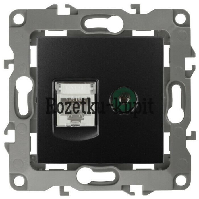Розетка телевизионная + интернет серии Эра 12 скрытой установки механизм цвет антрацит 12-3110-05. Сделана из поликарбоната. Монтаж в подрозетник производится и на лапки, и на винты. Рамки приобретаются отдельно. Рамки Эра 12: 1 пост 12-5001-хх, 2 поста 12-5002-хх, 3 поста 12-5003-хх, 4 поста 12-5004-хх, 5 постов 12-5005-хх. Рамки Эра 12 Сатин: 1 пост 12-5101-хх, 2 поста 12-5102-хх, 3 поста 12-5103-хх, 4 поста 12-5104-хх, 5 постов - 12-5105-хх (хх - код цвета: 01-белый, 02-слоновая кость, 03-алюминий, 04-шампань, 05-антрацит, 06-чёрный, 07-ольха(белёный дуб-сатин), 08-вишня, 09-дуб, 10-венге, 11-сосна, 21-жёлтый, 22-оранжевый, 23-красный, 24-охра, 25-бордо, 26-лайм, 27-зелёный, 28-голубой, 29-синий).