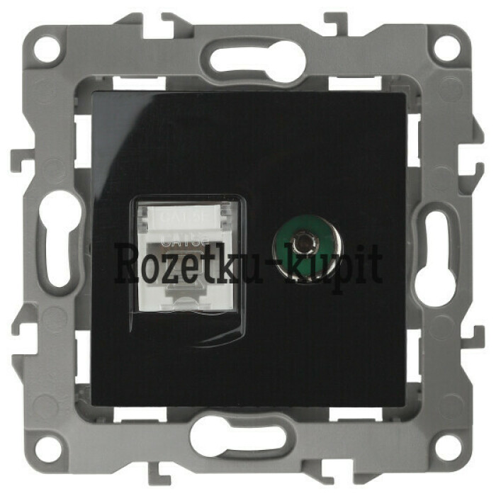 Розетка телевизионная + интернет серии Эра 12 скрытой установки механизм цвет чёрный 12-3110-06. Сделана из поликарбоната. Монтаж в подрозетник производится и на лапки, и на винты. Рамки приобретаются отдельно.