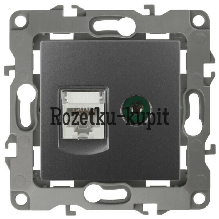 Розетка телевизионная + интернет серии Эра 12 скрытой установки механизм цвет графит 12-3110-12. Сделана из поликарбоната. Монтаж в подрозетник производится и на лапки, и на винты. Рамки приобретаются отдельно. Рамки Эра 12: 1 пост 12-5001-хх, 2 поста 12-5002-хх, 3 поста 12-5003-хх, 4 поста 12-5004-хх, 5 постов 12-5005-хх. Рамки Эра 12 Сатин: 1 пост 12-5101-хх, 2 поста 12-5102-хх, 3 поста 12-5103-хх, 4 поста 12-5104-хх, 5 постов - 12-5105-хх (хх - код цвета: 01-белый, 02-слоновая кость, 03-алюминий, 04-шампань, 05-антрацит, 06-чёрный, 07-ольха(белёный дуб-сатин), 08-вишня, 09-дуб, 10-венге, 11-сосна, 21-жёлтый, 22-оранжевый, 23-красный, 24-охра, 25-бордо, 26-лайм, 27-зелёный, 28-голубой, 29-синий).