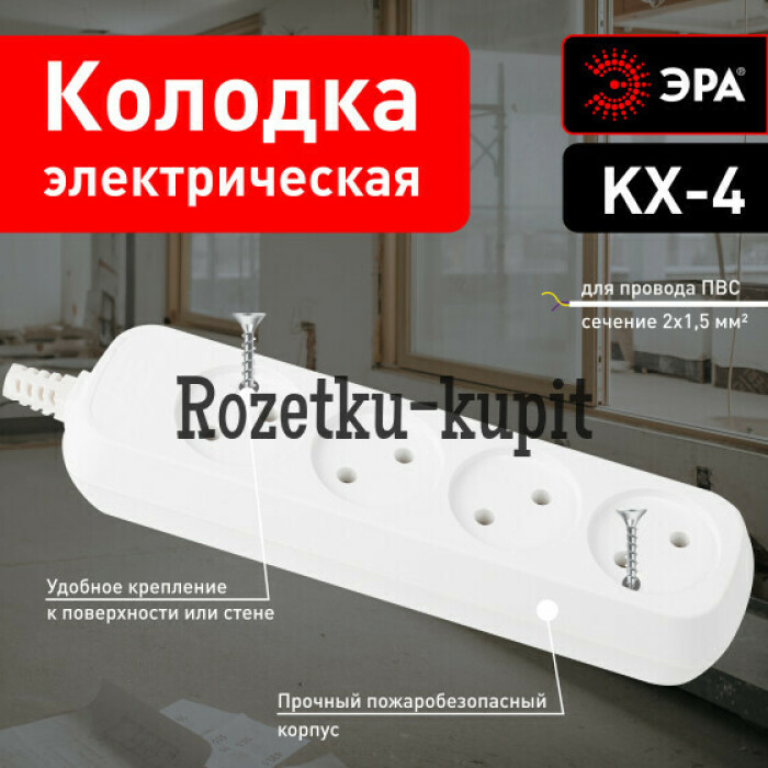 Колодка ЭРА KX-4. На 4 розетки без зазeмления. Максимальная мощность - 10 А/2200. Для кабеля до 2х1мм2