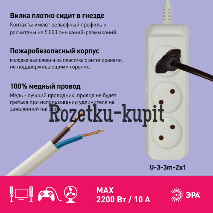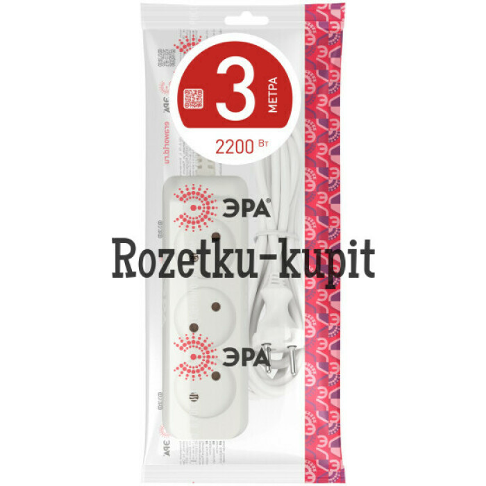 Удлинитель электрический Эра U-3-3m без заземления, ПВС, 2x1мм2, 3 розетки, 3м. Рассчитан на максимальную мощность 10А/2200 Вт. Удлинитель Эра станет Вашим надежным помощником, если Ваши любимые электроприборы находятся далеко от розеток. Провод в удлинителях Эра сделан из 100% меди, что делает его абсолютно пожаробезопасным. Корпус выполнен из ударопрочного и негорючего пластика (полипропилен). В моделях с заземлением у вилки есть кольцо для удобного извлечения из розетки. Модель удлинителя на 10А позволяет подключить мощные бытовые приборы общей нагрузкой до 2200Вт. Не бойтесь включить чайник, обогреватель, микроволновку или другие электроприборы. Толстый провод удлинителя Эра гарантирует полную безопасность. Дизайн удлинителя разработан в России командой Эра Style.