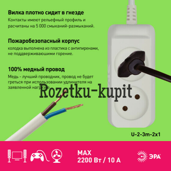 Компактный удлинитель ЭРА U-2-3m-2x1 на 2 розетки, без заземления, с проводом 3 метра. Можно использовать для мощных электроприборов. Максимальная нагрузка - 10 А / 2200 Вт. Изготовлен из надёжного полипропилена со специальными антипиренами, препятствующими горению. Прочный и гибкий двухжильный провод ПВС 2x1мм2. Удобная вилка и аккуратный внешний вид с закруглёнными углами. Эксплуатируется при температурах в помещении от -25 до +40 С.