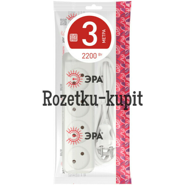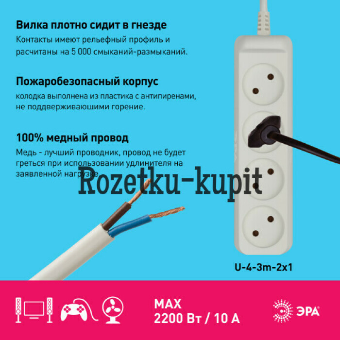 Удлинитель электрический Эра U-4-3m без заземления, ПВС, 2x1мм2, 4 розетки, 3м. Рассчитан на максимальную мощность 10А/2200 Вт. Удлинитель Эра станет Вашим надежным помощником, если Ваши любимые электроприборы находятся далеко от розеток. Провод в удлинителях Эра сделан из 100% меди, что делает его абсолютно пожаробезопасным. Корпус выполнен из ударопрочного и негорючего пластика (полипропилен). В моделях с заземлением у вилки есть кольцо для удобного извлечения из розетки. Модель удлинителя на 10А позволяет подключить мощные бытовые приборы общей нагрузкой до 2200Вт. Не бойтесь включить чайник, обогреватель, микроволновку или другие электроприборы. Толстый провод удлинителя Эра гарантирует полную безопасность. Дизайн удлинителя разработан в России командой Эра Style.