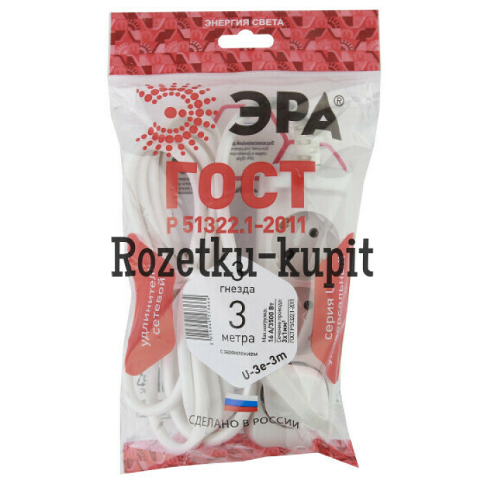 Удлинитель электрический Эра U-3e-3m с заземлением, ПВС, 3x1мм2, 3 розетки, 3м. Рассчитан на максимальную мощность 16А/3500 Вт. Удлинитель Эра станет Вашим надежным помощником, если Ваши любимые электроприборы находятся далеко от розеток. Провод в удлинителях Эра сделан из 100% меди, что делает его абсолютно пожаробезопасным. Корпус выполнен из ударопрочного и негорючего пластика (полипропилен). В моделях с заземлением у вилки есть кольцо для удобного извлечения из розетки. Модель удлинителя на 16А позволяет подключить мощные бытовые приборы общей нагрузкой до 3500Вт. Не бойтесь включить чайник, обогреватель, микроволновку или другие электроприборы. Толстый провод удлинителя Эра гарантирует полную безопасность. Дизайн удлинителя разработан в России командой Эра Style.