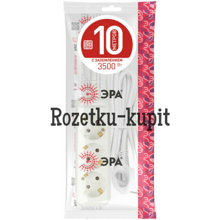 Удлинитель электрический Эра U-3e-10m-3x1 с заземлением, ПВС, 3x1мм2, 3 розетки, 10м. Рассчитан на максимальную мощность 16А/3500 Вт. Удлинитель Эра станет Вашим надежным помощником, если Ваши любимые электроприборы находятся далеко от розеток. Провод в удлинителях Эра сделан из 100% меди, что делает его абсолютно пожаробезопасным. Корпус выполнен из ударопрочного и негорючего пластика (полипропилен). В моделях с заземлением у вилки есть кольцо для удобного извлечения из розетки. Модель удлинителя на 16А позволяет подключить мощные бытовые приборы общей нагрузкой до 3500Вт. Не бойтесь включить чайник, обогреватель, микроволновку или другие электроприборы. Толстый провод удлинителя Эра гарантирует полную безопасность. Дизайн удлинителя разработан в России командой Эра Style.