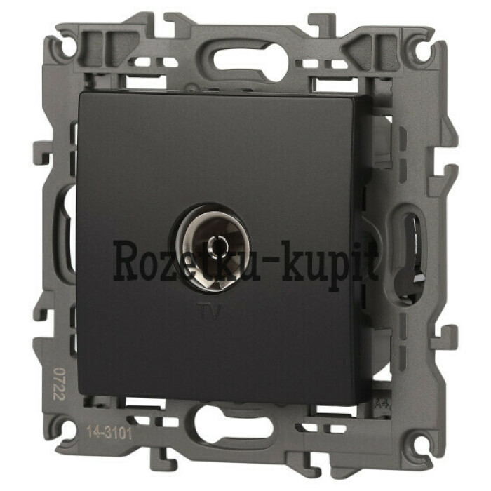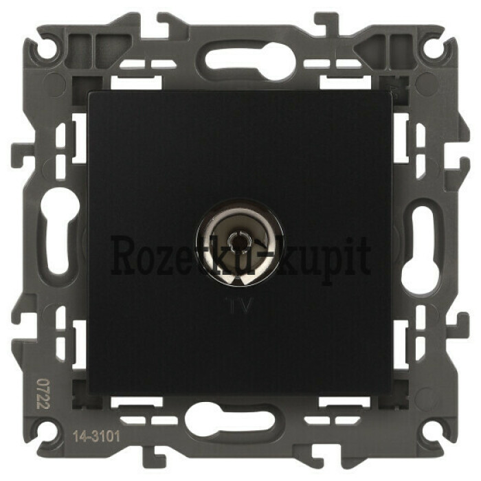 Розетка телевизионная одиночная серии Эра Elegance цвет антрацит 14-3101-05. Рамки приобретаются отдельно. Рамки Эра Elegance ПЛАСТИК: 1 пост 14-5001-хх, 2 поста 14-5002-хх, 3 поста 14-5003-хх, 4 поста 14-5004-хх, 5 постов 14-5005-хх; СТЕКЛО: 1 пост 14-5101-хх, 2 поста 14-5102-хх, 3 поста 14-5103-хх, 4 поста 14-5104-хх; МЕТАЛЛ: 1 пост 14-5201-хх, 2 поста 14-5202-хх, 3 поста 14-5203-хх, 4 поста 14-5204-хх; ДЕРЕВО: 1 пост 14-5301-хх, 2 поста 14-5302-хх, 3 поста 14-5303-хх, 4 поста 14-5304-хх (хх - код цвета: 00-прозрачный, 01-белый, белёный дуб, 02-слоновая кость, 03-алюминий, 04-шампань, 05-чёрный, чёрное дерево, 07-ясень, 09-дуб, 10-венге, 11-клён, 14-медь, 21-жёлтый, 22-оранжевый, 23-красный, 25-бордо, 26-лайм, 27-зелёный, 28-голубой, 29-синий, 30-розовый, 31-мокко, 32-серый, 41-сталь, 42-титан).