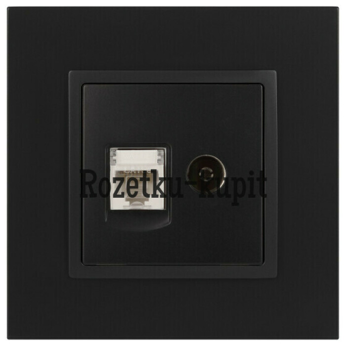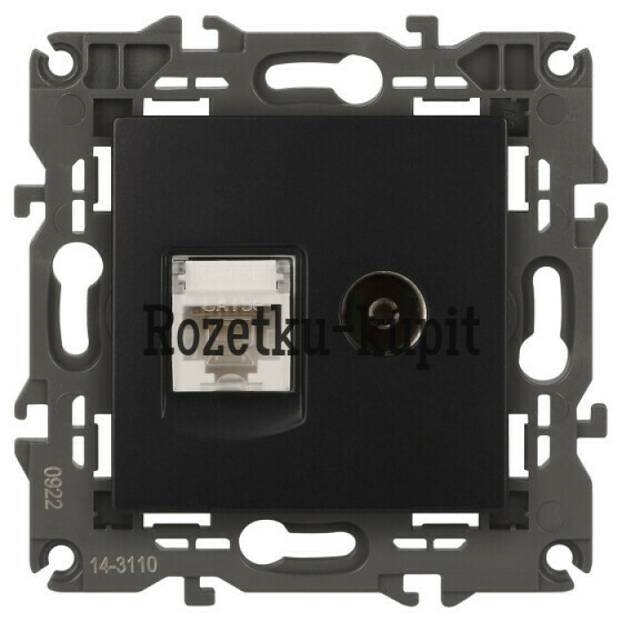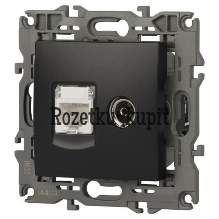Розетка телевизионная + интернет серии Эра Elegance цвет антрацит 14-3110-05. Рамки приобретаются отдельно. Рамки Эра Elegance ПЛАСТИК: 1 пост 14-5001-хх, 2 поста 14-5002-хх, 3 поста 14-5003-хх, 4 поста 14-5004-хх, 5 постов 14-5005-хх; СТЕКЛО: 1 пост 14-5101-хх, 2 поста 14-5102-хх, 3 поста 14-5103-хх, 4 поста 14-5104-хх; МЕТАЛЛ: 1 пост 14-5201-хх, 2 поста 14-5202-хх, 3 поста 14-5203-хх, 4 поста 14-5204-хх; ДЕРЕВО: 1 пост 14-5301-хх, 2 поста 14-5302-хх, 3 поста 14-5303-хх, 4 поста 14-5304-хх (хх - код цвета: 00-прозрачный, 01-белый, белёный дуб, 02-слоновая кость, 03-алюминий, 04-шампань, 05-чёрный, чёрное дерево, 07-ясень, 09-дуб, 10-венге, 11-клён, 14-медь, 21-жёлтый, 22-оранжевый, 23-красный, 25-бордо, 26-лайм, 27-зелёный, 28-голубой, 29-синий, 30-розовый, 31-мокко, 32-серый, 41-сталь, 42-титан).