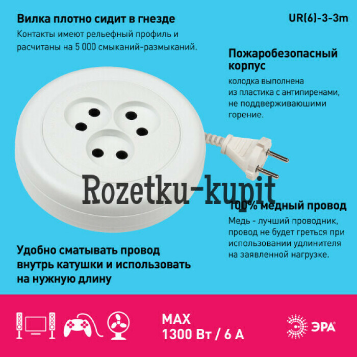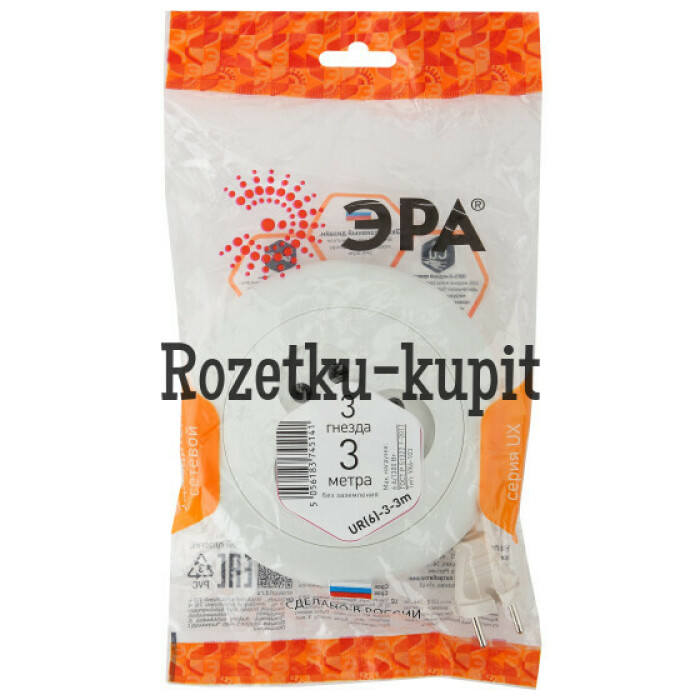 Удлинитель ЭРА серии UX без заземления: провод ШВВП 2x0.75мм2, корпус - ABS-пластик, негорючие вставки из армлена, максимальная нагрузка - 6A/1300Вт