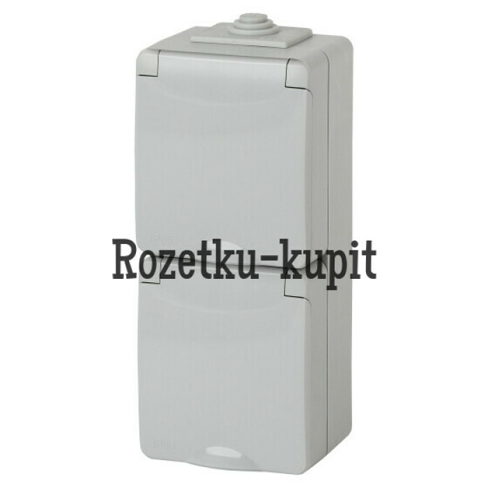 Розетка 2х2P+E верт. IP65, шторки, 16АХ-250В, ОУ, Эра Эксперт, серый.