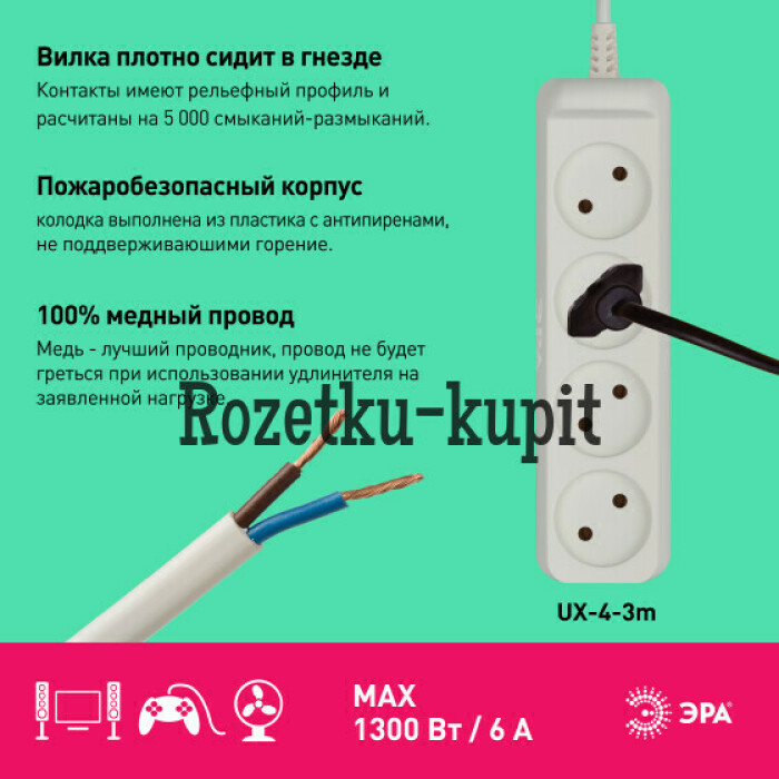 Удлинитель электрический ЭРА UX-4-3m, без заземления, 4 розетки. Серия UX. Для подключения маломощных устройств до 6 А/ 1300т. Провод ШВВП 2х0,75м2 длиной 3 м.