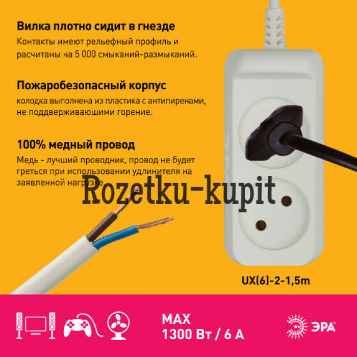 Удобный бытовой удлинитель ЭРА UX(6)-2-1,5m на 2 розетки, без заземления, провод 1,5 м, ПВС, 2x0,75мм2. Рассчитан на максимальную мощность 6А / 1300Вт. Удлинитель Эра станет Вашим надежным помощником, если Ваши любимые электроприборы находятся далеко от розеток. Модель удлинителя на 6А позволяет подключить бытовые приборы общей нагрузкой до 1300Вт. Дизайн удлинителя разработан в России командой Эра Style.