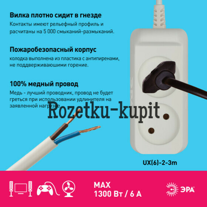 Удлинитель электрический Эра UX(6)-2-3m с заземлением, ПВС, 2x0,75мм2, 2 розетки, 3 м. Рассчитан на максимальную мощность 6А/1300 Вт. Удлинитель Эра станет Вашим надежным помощником, если Ваши любимые электроприборы находятся далеко от розеток. Модель удлинителя на 6А позволяет подключить бытовые приборы общей нагрузкой до 1300Вт. Дизайн удлинителя разработан в России командой Эра Style.