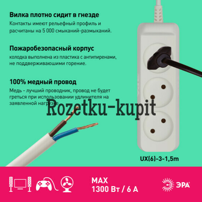 Удобный бытовой удлинитель ЭРА UX(6)-3-1,5m на 3 розетки, без заземления. Рассчитан на одновременное подключение к розетке до трёх маломощных электроприборов. Максимальная нагрузка - 6 A/ 1300 Вт. Длина шнура-1,5 метра. Надёжный двухжильный провод ПВС. Корпус изготовлен из прочного негорючего полипропилена, в составе - защищающие от возгорания антипирены. Закруглённые углы, брендирование на вилке и корпусе, базовый белый цвет- этот удлинитель отличается аккуратным приятным дизайном.