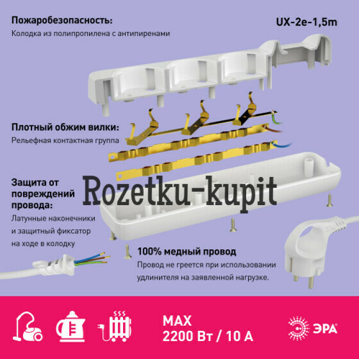 Компактный бытовой удлинитель ЭРА UX-2e-1,5m с заземлением и удобной вилкой с кольцом. Длина шнура - 1,5 метра, 2 розетки. Позволяет подключать электроприборы с максимальной нагрузкой 10 А/ 2200 Вт. Этот надёжный и безопасный удлинитель изготовлен из негорючих материалов и имеет трёхжильный медный провод ПВС.