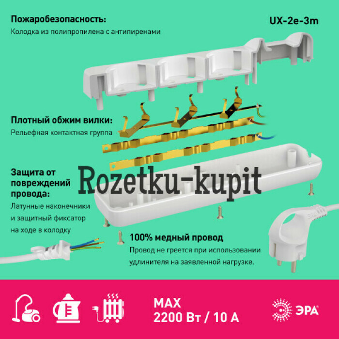 Компактный бытовой удлинитель ЭРА UX-2e-3m с заземлением и удобной вилкой с кольцом. Длина шнура - 3 метра, 2 розетки. Позволяет подключать электроприборы с максимальной нагрузкой 10 А/ 2200 Вт. Этот надёжный и безопасный удлинитель изготовлен из негорючих материалов и имеет трёхжильный медный провод ПВС.