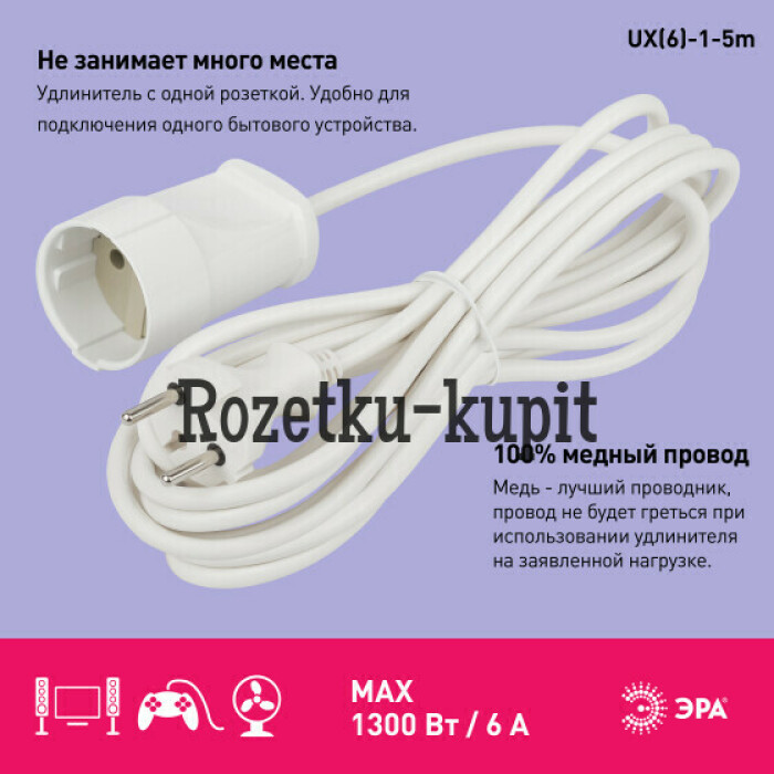Удлинитель электрический Эра UX(6)-1-5m без заземления, 1 розетка, провод ПВС 2x0,75мм2, длиной 5 м. Рассчитан на максимальную мощность 6А/1300Вт. Удлинитель Эра станет Вашим надежным помощником, если Ваши любимые электроприборы находятся далеко от розеток. Модель удлинителя на 6А позволяет подключить бытовые приборы общей нагрузкой до 1300Вт. Дизайн удлинителя разработан в России командой Эра Style.