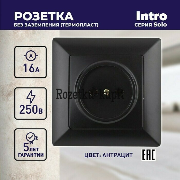 Розетка серии Intro Solo скрытой установки цвет антрацит 4-201-05. Номинальные характеристики 16А 250В. Розетка выполнена из негорючего термопласта, укомплектована одноместной рамкой, оснащена винтовыми клеммами. Клеммы с двумя отверстиями позволяют соединять соседние розетки шлейфом. Установка в подрозетник производится как на монтажные лапки, так и на винты. Для установки 2-х и более устройств в несколько подрозетников в ряд дополнительно используются многоместные рамки: 2-х постовая - 4-502-хх, 3-х постовая 4-503-хх, 4-х постовая - 4-504-хх (где хх - цветовой код: 01 - белый, 02 - слоновая кость, 03 - алюминий, 04 - шампань, 05 - антрацит, 10 - венге, 11 - сосна).