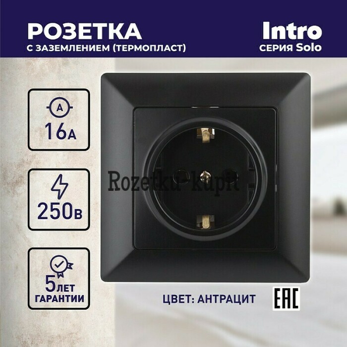 Розетка Intro Solo 4-202-05 антрацит с заземлением, для скрытой установки. Соответствует стандартам безопасности, нагрузка до 16А.