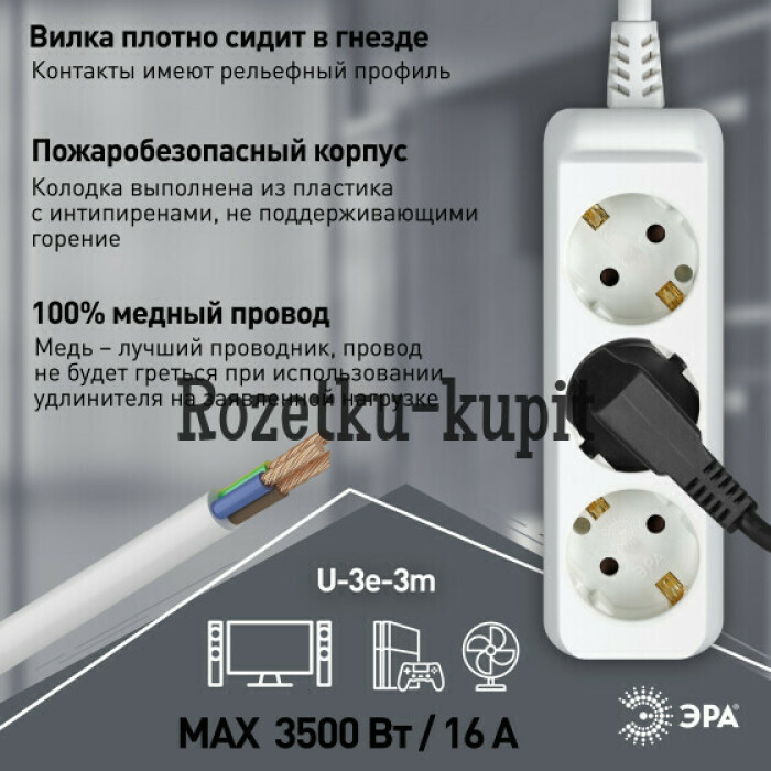 Удлинитель электрический Эра U-3e-3m-3x1,5 с заземлением, 3 розетки, 3м ПВС 3x1,5мм2. Для мощных приборов. Рассчитан на максимальную мощность 16А/3500. Удлинитель Эра станет Вашим надежным помощником, если Ваши любимые электроприборы находятся далеко от розеток.