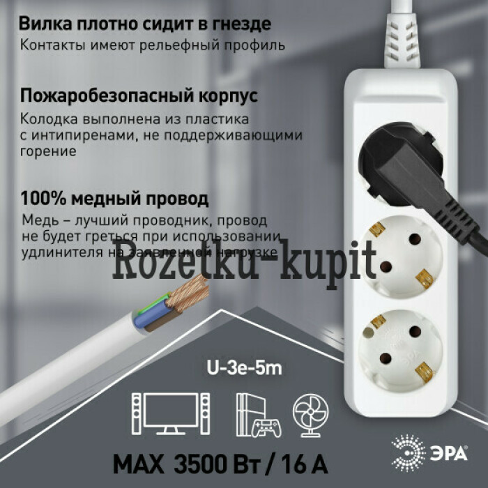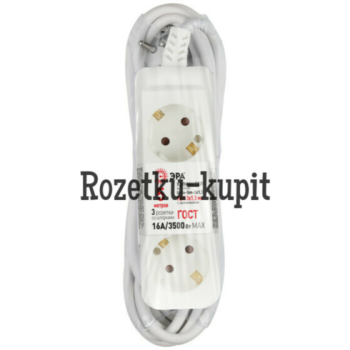 Удлинитель электрический Эра U-3e-5m-3x1,5 с заземлением, 3 розетки, 5м ПВС 3x1,5мм2. Для мощных приборов. Рассчитан на максимальную мощность 16А/3500. Удлинитель Эра станет Вашим надежным помощником, если Ваши любимые электроприборы находятся далеко от розеток.