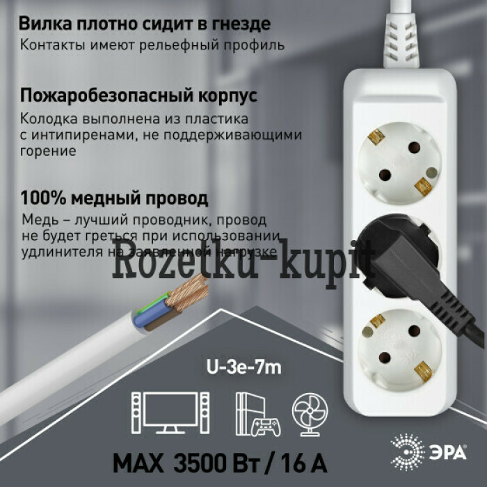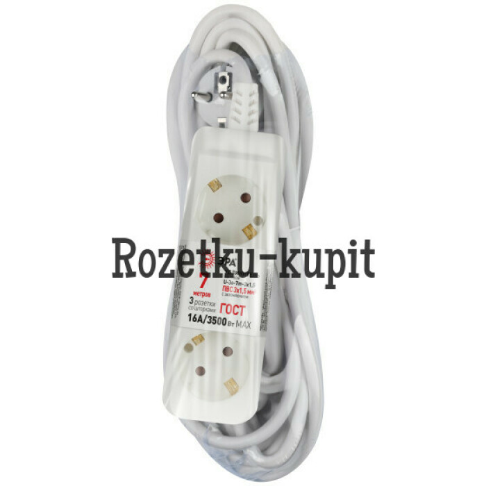 Удлинитель электрический Эра U-3e-7m-3x1,5 с заземлением, 3 розетки, 7м ПВС 3x1,5мм2. Для мощных приборов. Рассчитан на максимальную мощность 16А/3500. Удлинитель Эра станет Вашим надежным помощником, если Ваши любимые электроприборы находятся далеко от розеток.