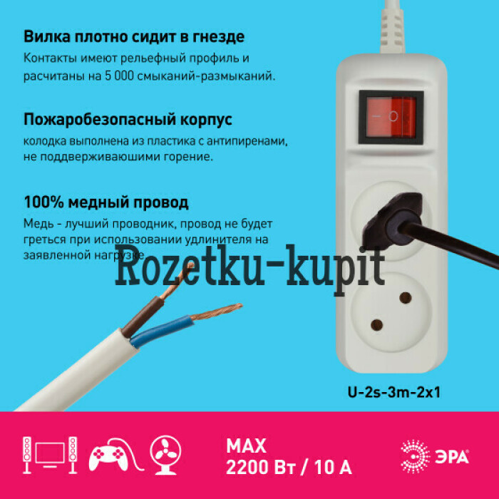 Удлинитель электрический Эра U-2s-3m-2x1 без заземления, с выключателем, ПВС, 2x1мм2, 2 розетки, 3м. Рассчитан на максимальную мощность 10А/2200 Вт. Удлинитель Эра станет Вашим надежным помощником, если Ваши любимые электроприборы находятся далеко от розеток. Провод в удлинителях Эра сделан из 100% меди, что делает его абсолютно пожаробезопасным. Корпус выполнен из ударопрочного и негорючего пластика (полипропилен). Модель удлинителя на 10А позволяет подключить бытовые приборы общей нагрузкой до 2200Вт. Дизайн удлинителя разработан в России командой Эра Style.