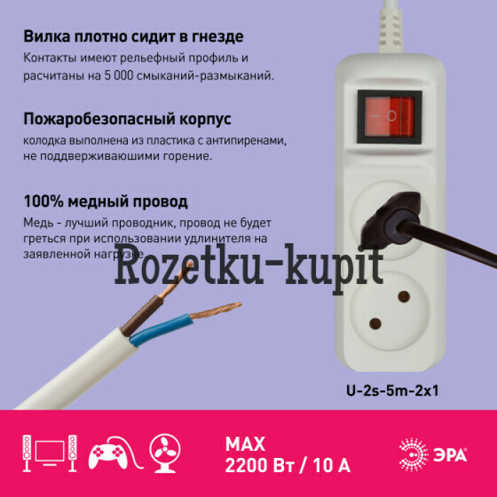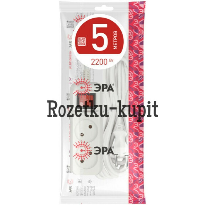 Удлинитель электрический Эра U-2s-3m-2x1 без заземления, с выключателем, ПВС, 2x1мм2, 2 розетки, 5м. Рассчитан на максимальную мощность 10А/2200 Вт. Удлинитель Эра станет Вашим надежным помощником, если Ваши любимые электроприборы находятся далеко от розеток. Провод в удлинителях Эра сделан из 100% меди, что делает его абсолютно пожаробезопасным. Корпус выполнен из ударопрочного и негорючего пластика (полипропилен). Модель удлинителя на 10А позволяет подключить бытовые приборы общей нагрузкой до 2200Вт. Дизайн удлинителя разработан в России командой Эра Style.