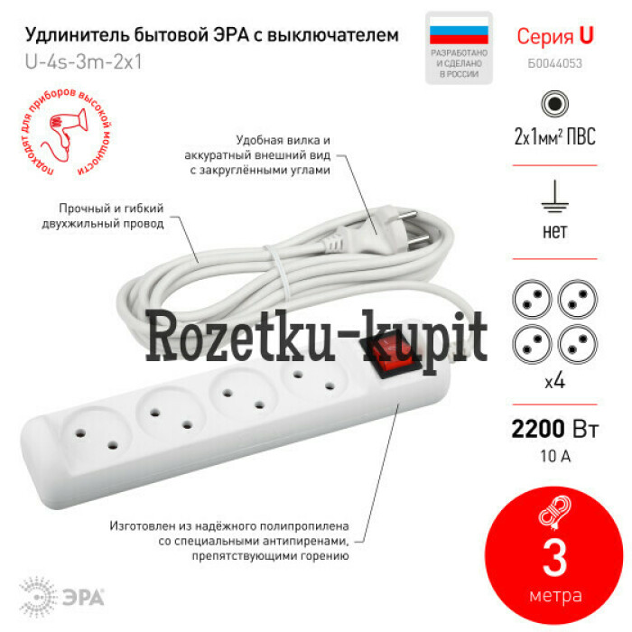 Удлинитель электрический Эра U-4s-3m-2x1 без заземления, с выключателем, ПВС, 2x1мм2, 4 розетки, 3 м. Рассчитан на максимальную мощность 10А/2200 Вт. Удлинитель Эра станет Вашим надежным помощником, если Ваши любимые электроприборы находятся далеко от розеток. Провод в удлинителях Эра сделан из 100% меди, что делает его абсолютно пожаробезопасным. Корпус выполнен из ударопрочного и негорючего пластика (полипропилен). Модель удлинителя на 10А позволяет подключить бытовые приборы общей нагрузкой до 2200Вт. Дизайн удлинителя разработан в России командой Эра Style.