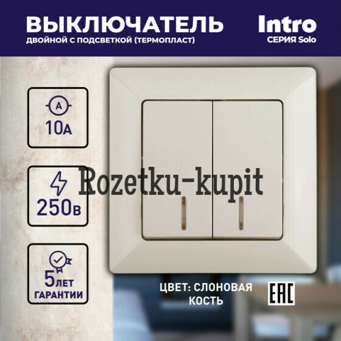 Выключатель Intro Solo 4-105-02 двухклавишный с подсветкой, 10А-250В, IP20, СУ, слоновая кость