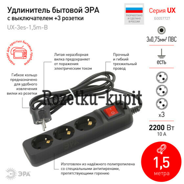 Удлинитель электрический Эра UX-3es-1,5m-B с заземлением, с выключателем, черный, 3 розетки. Провод ПВС, 3x0,75мм2, 1,5 м. Рассчитан на максимальную мощность 10А/2200 Вт. Удлинитель Эра станет Вашим надежным помощником, если Ваши любимые электроприборы находятся далеко от розеток. Провод в удлинителях Эра сделан из 100% меди, что делает его абсолютно пожаробезопасным. Корпус выполнен из ударопрочного и негорючего пластика (полипропилен). Вилка обеспечена кольцом для удобного извлечения ее из розетки. Модель удлинителя на 10А позволяет подключить бытовые приборы общей нагрузкой до 2200Вт. Дизайн удлинителя разработан в России командой Эра Style.