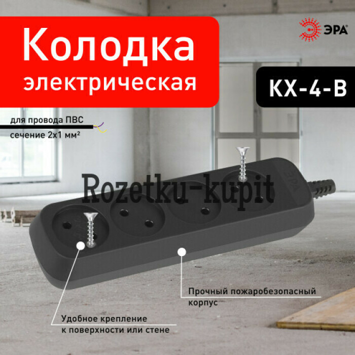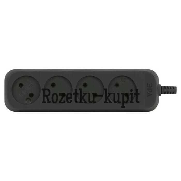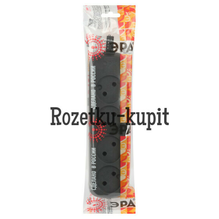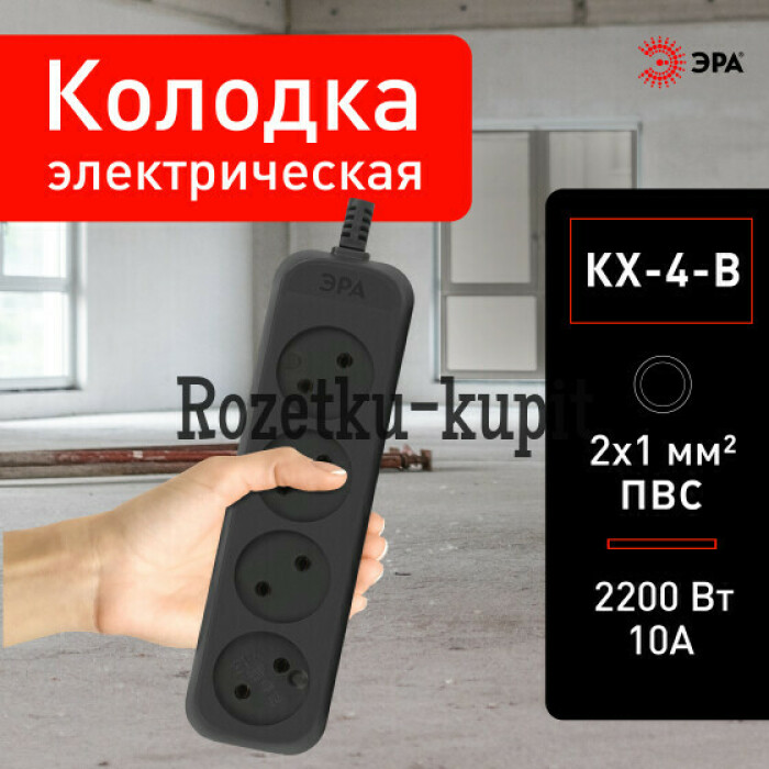 Колодка ЭРА KX-4-B на 4 розетки, без заземления, черная. Максимальная мощность - 10 А/2200 Вт. Для кабеля до 2х1мм2