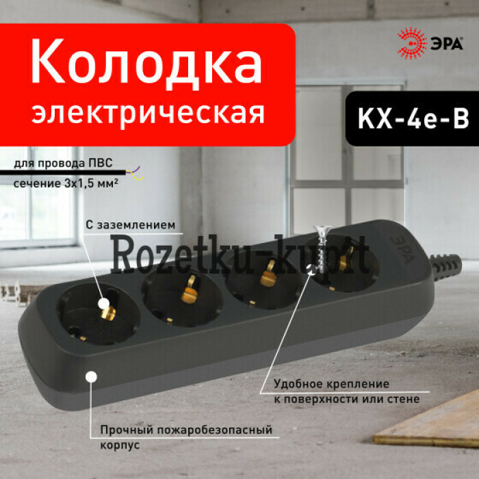 Колодка ЭРА KX-4e-B на 4 розетки, с заземлением, черная. Максимальная мощность - 16 А/3500 Вт. Для кабеля до 3х1,5мм2