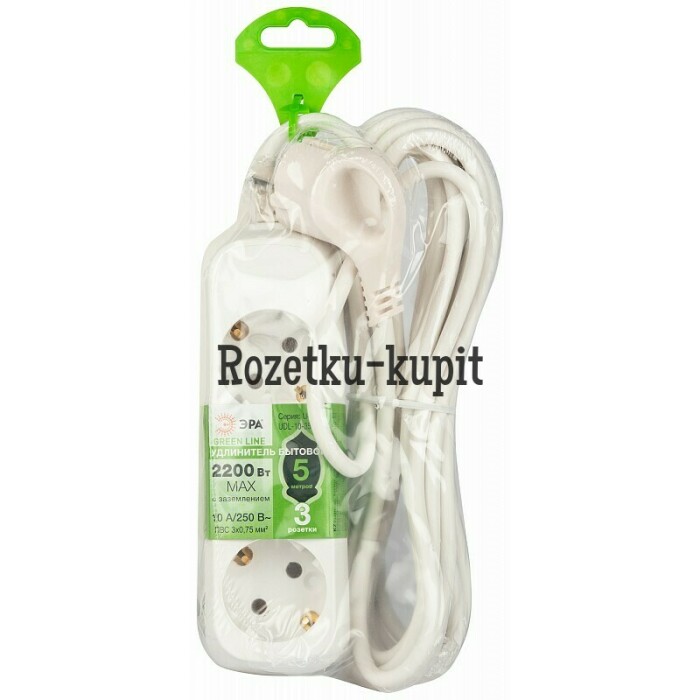 Удлинитель электрический Эра GREENLINE UDL-10-350-E с заземлением, 3 розетки, провод 5м ПВС 3x0,75мм2. Рассчитан на максимальную мощность 10А/2200 Вт. Удлинитель станет Вашим надежным помощником, если любимые электроприборы находятся далеко от розеток. Корпус выполнен из ударопрочного и негорючего пластика (полипропилен). Вилка обеспечена кольцом для удобного извлечения ее из розетки. Модель удлинителя на 10А позволяет подключить бытовые приборы общей нагрузкой до 2200Вт.