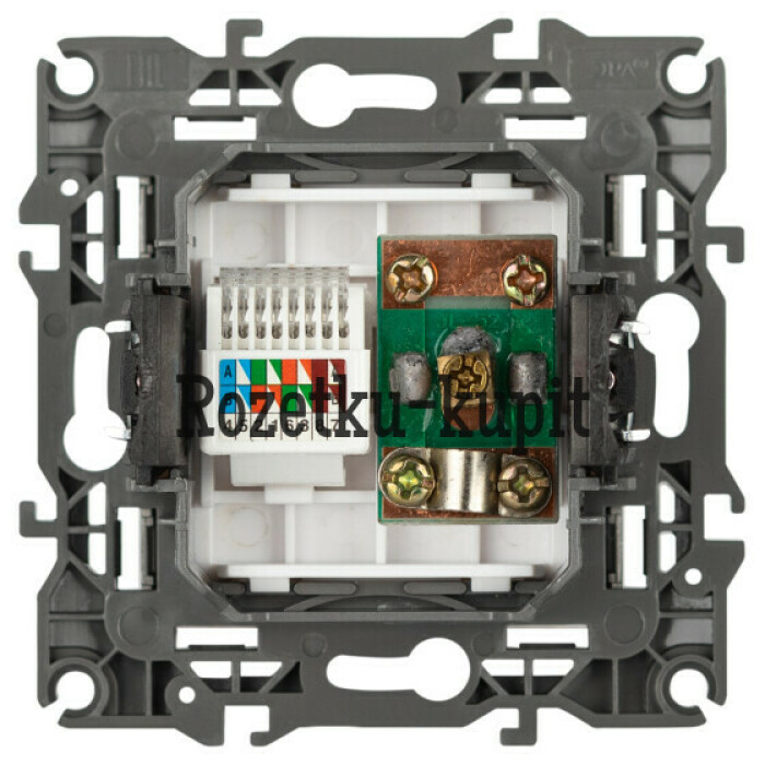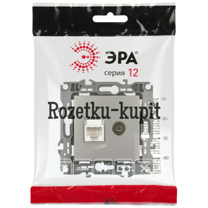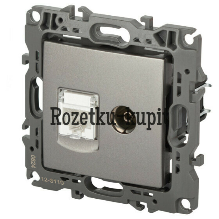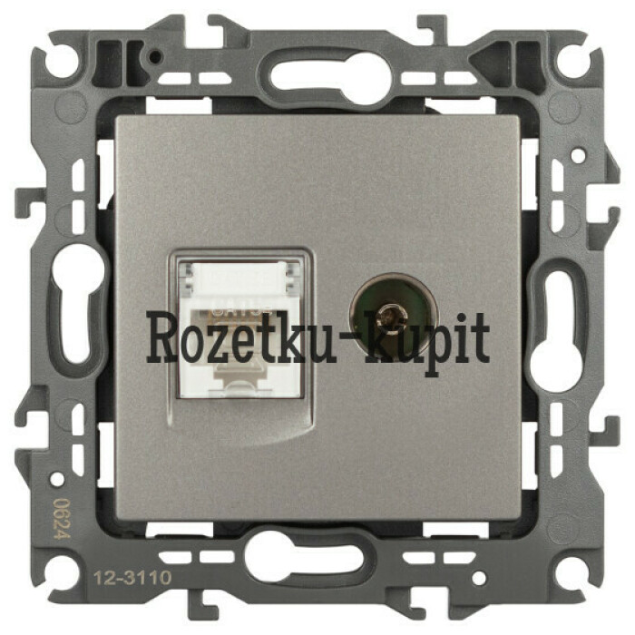 Розетка телевизионная + информационная TV+RJ45 серии Эра 12 скрытой установки механизм цвет титан 12-3110-16. Сделана из поликарбоната. Монтаж в подрозетник производится и на лапки, и на винты. Рамки приобретаются отдельно.