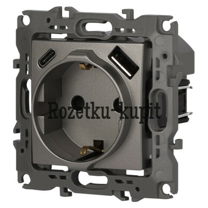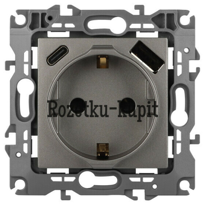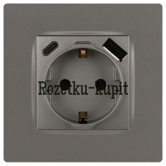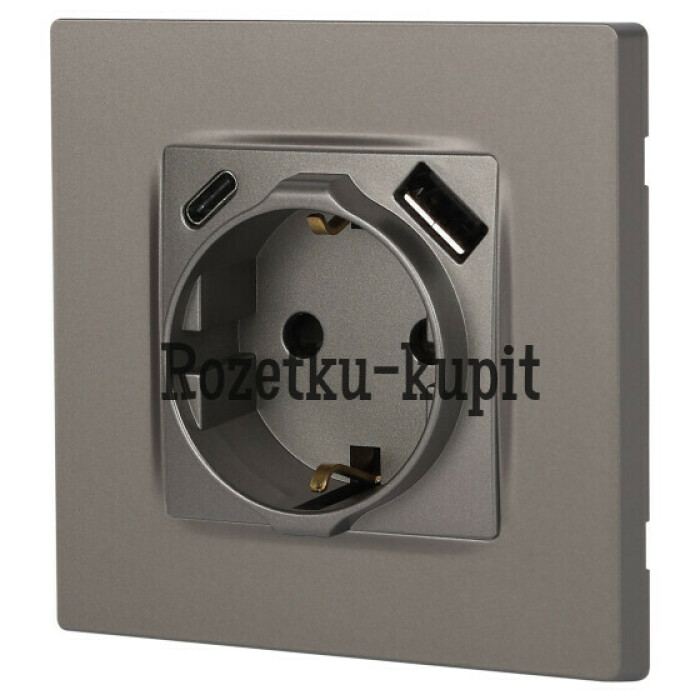 Розетка с USB A+C серии Эра12 12-4108-16 цвет титан. Номинальные характеристики: розетка силовая – 16А 250В. Розетка USB type A – 3A 5В. Розетка USB type C – 3A 5В. Рамки приобретаются отдельно