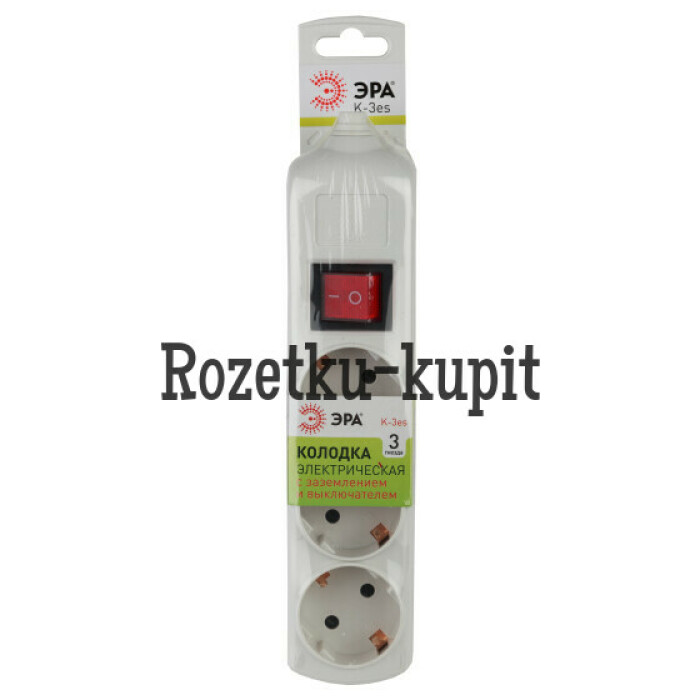 Колодка электрическая Эра K-3es с заземлением, с выключателем, 3 розетки. Корпус выполнен из ударопрочного и негорючего пластика. Рассчитана на максимальную мощность 16А / 3500 Вт и для подключения кабеля сечением до 1,5мм2. Электрическая колодка подойдет для тех, кто хочет сделать удлинитель самостоятельно. Также может использоваться как накладные розеточные блоке в подсобных помещениях.