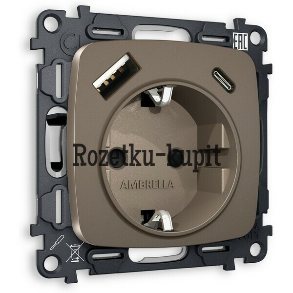 4 010 у3 748 уСкидка 262 уВ наличииAmbrella MO640010Комплект механизма электрической розетки OMEGA MO640010 Темная бронза матовый 2USB A+C 20W 3000mA (быстрая зарядка) 180-220V/50Hz (5V3A, 9V2.22A, 12V1.66A) с заземлением со шторками 16A-250V 50Hz 2P+E QUANT (OP6400, VM160) -
