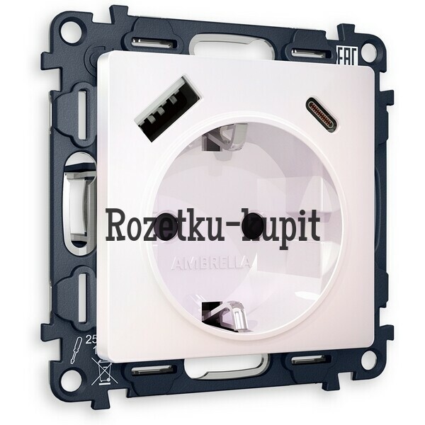 4 198 у3 748 уСкидка 450 уВ наличииAmbrella MA130010Комплект механизма электрической розетки ALFA MA130010 Белый матовый 2USB A+C 20W (быстрая зарядка) с заземлением со шторками (AP1300, VM160) -