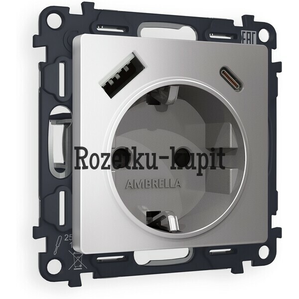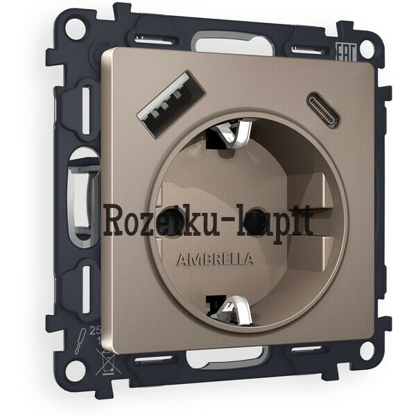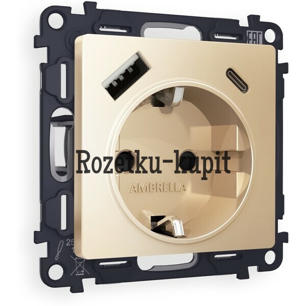 4 010 у3 748 уСкидка 262 уВ наличииAmbrella MA610010Комплект механизма электрической розетки ALFA MA610010 Шампань 2USB A+C 20W 3000mA (быстрая зарядка) 180-220V/50Hz (5V3A, 9V2.22A, 12V1.66A) с заземлением со шторками 16A-250V 50Hz 2P+E QUANT (AP6100, VM160) -