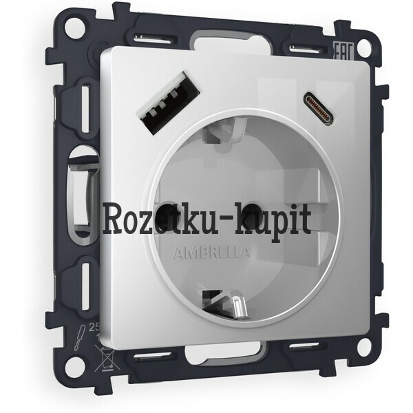 3 935 у3 748 уСкидка 187 уВ наличииAmbrella MA410010Комплект механизма электрической розетки ALFA MA410010 Серебро глянец 2USB A+C 20W (быстрая зарядка) 180-220V/50Hz (5V3A, 9V2.22A, 12V1.66A) с заземлением со шторками 16A-250V 50Hz 2P+E QUANT (AP4100, VM160) -